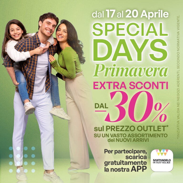 Da venerdì 17 a lunedì 20 Aprile, Special Days per Special Shopping da fare rigorosamente a Santangelo Outlet Village,grazie a extra sconti dal – 30% sul prezzo outlet su un vasto assortimento dei Nuovi Arrivi, nei negozi aderenti.